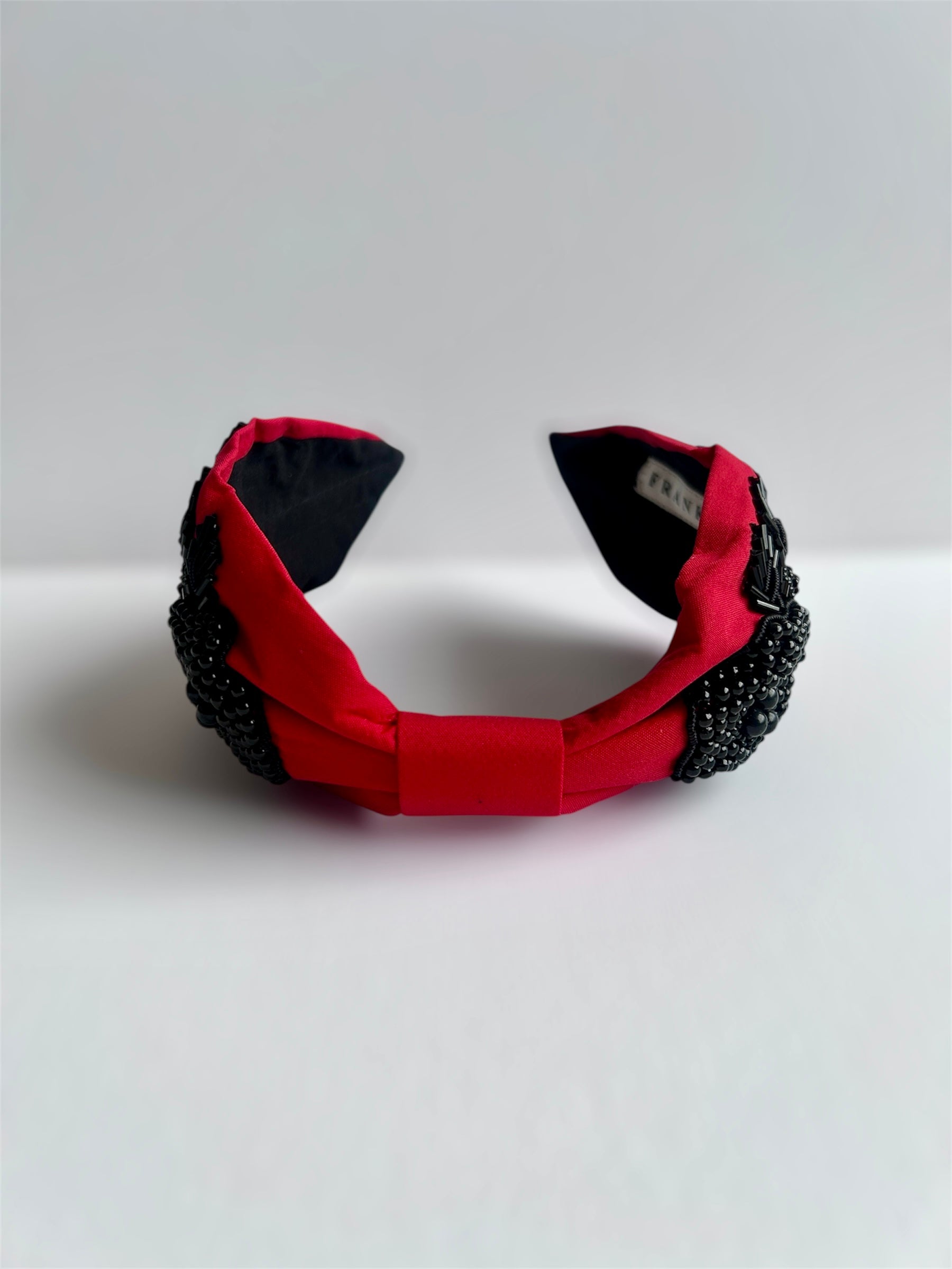 This headband features a vibrant red fabric base embellished with striking black hand-beaded and embroidered floral motifs. The design showcases layered beadwork, sequins, and tubular beads arranged into bold flower and leaf patterns, creating a rich, textured surface with dramatic contrast.